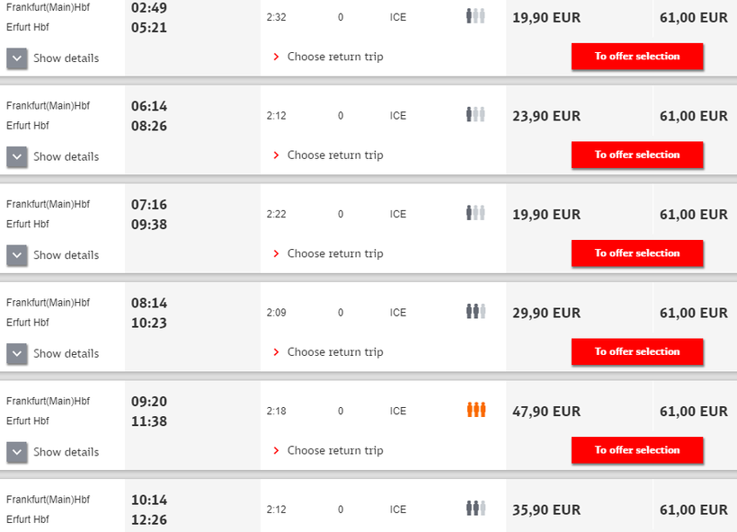 Уехать от главного ж/д вокзала Франкфурта-на-Майне (Frankfurt Hauptbahnhof) в Эрфурт можно ежедневно с 06:14 до 21:19 каждый час, а еще есть дополнительный ночной поезд в 02:49.