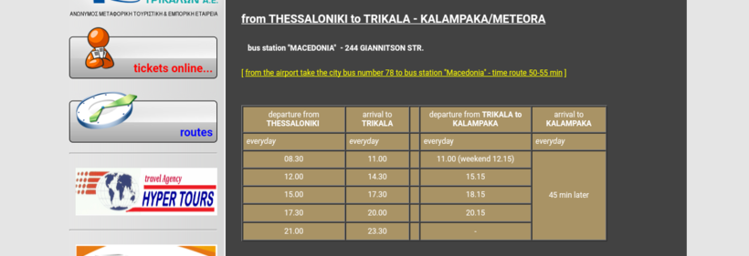 Их текущее расписание и стоимость билетов есть на сайте перевозчика. Обратите внимание, последний рейс в Каламбаку не доезжает. Отправляются автобусы от автостанции Makedonia, это как раз конечная маршрута 45, а прибывают в Каламбаку по адресу Ikonomou 9.