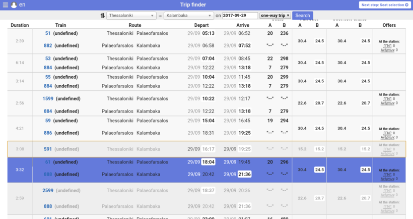 Поезда в Каламбаку ездят в течение дня, и подобрать сносный вариант всегда можно. Есть даже один прямой рейс, в остальных же случаях придется совершить пересадку в Palaeofarsalos. Расписание зимой и летом значительно отличается, я говорю про летнее.