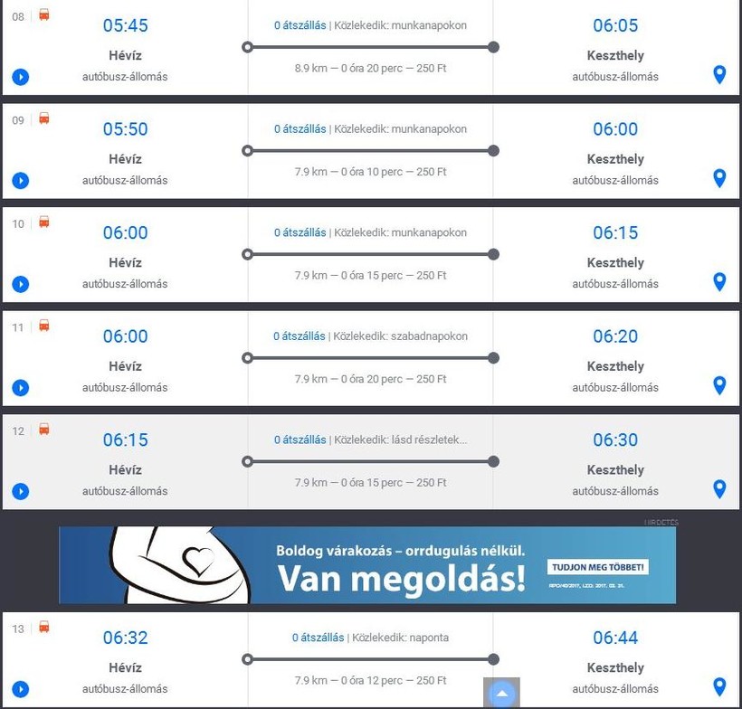 Автобусы ездят с пяти часов утра и до одиннадцати вечера буквально один за одним. Так что, приходите, ищите табличку “Keszthely” и вперед. Привезут вас на автовокзал Кестхея, который находится на Mártírok útja 2, неподалеку от ЖД.