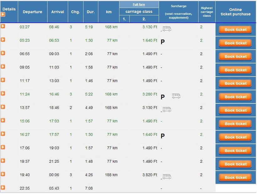 Покупка проездных документов возможна через интернет, а также в автомате или в кассе в здании вокзала. Заранее это делать не обязательно, билеты не закончатся, да и дешевле не будет, цена на проезд в Венгрии фиксированная.