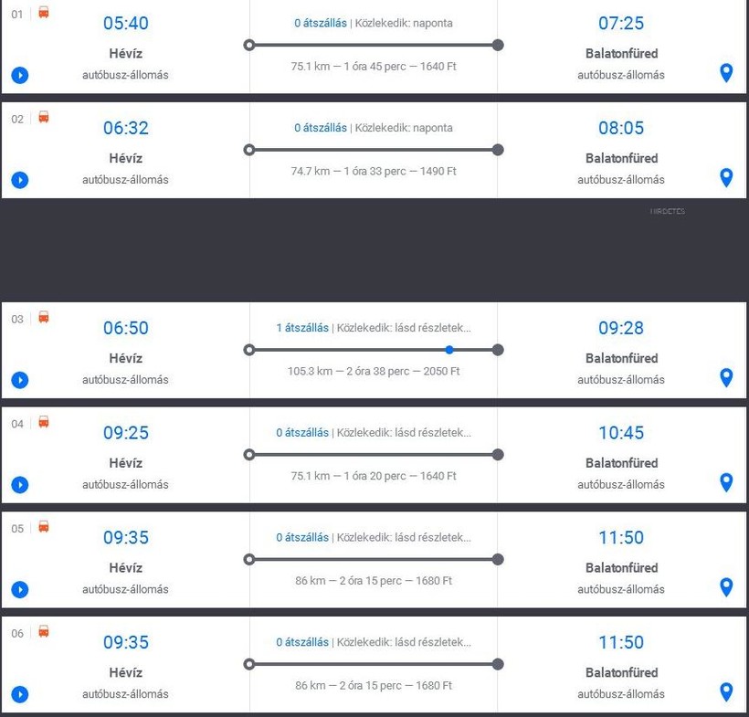 Уехать в Балатонфюред можно с пяти утра до шести вечера. Всего в день 17-19 рейсов, большинство из них прямые. Все автобусы отправляются от автостанции Хевиза. Ехать не долго, 1,5-2 часа, если рейс прямой, и 2-3 часа, если с пересадкой. Автовокзал в Балатонфюреде находится прямо рядышком с ЖД.