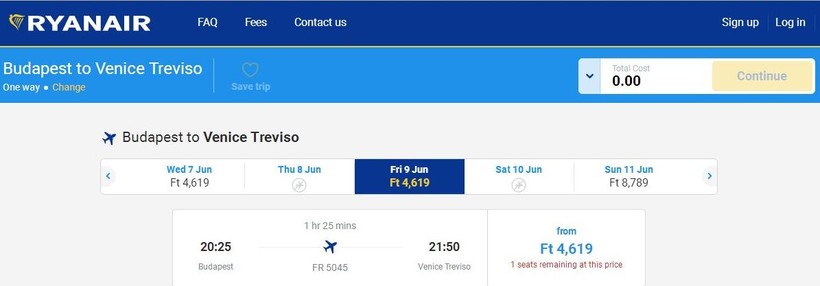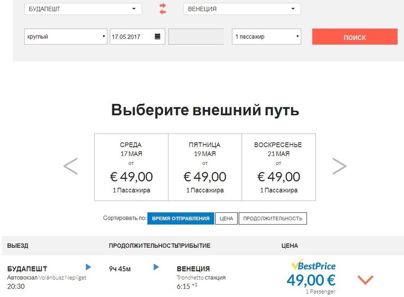 У итальянцев на наши даты была указана стоимость билета – 49 евро с пометкой «лучшая цена». На венгерском же мы обнаружили те же билеты по цене 36 евро. В общем, проверяйте и там, и там.