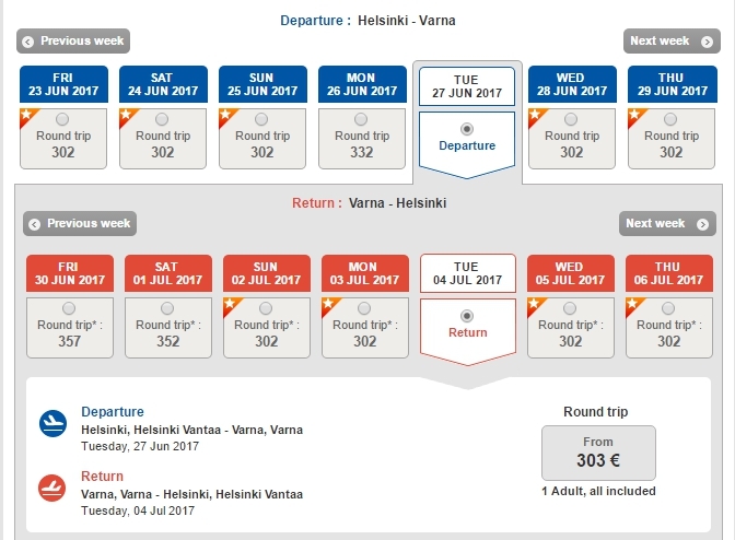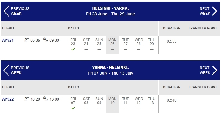 Единственный прямой рейс из Хельсинки в Варну выполняет компания Finnair, это сезонный рейс с 23 июня по 11 августа. И, к огромному нашему сожалению, только один раз в неделю - по пятницам. Вот так выглядит скромное расписание на сайте авиакомпании.