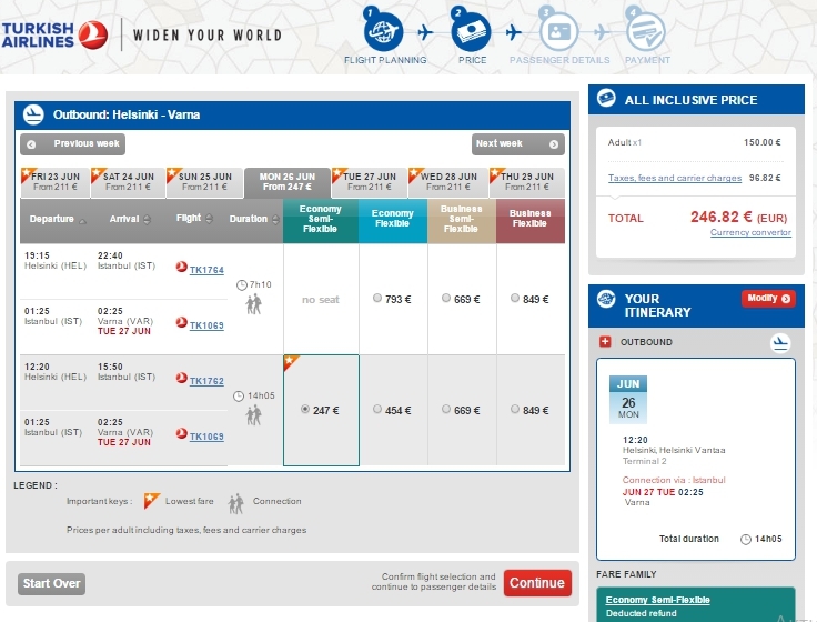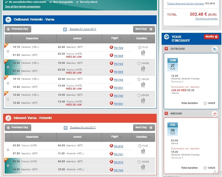 Причем, в день может быть несколько вариантов пересадки. Самый быстрый займет семь часов. Отправившись в 19:15 из Хельсинки, вы прибудете в пол-третьего ночи в Варну. Стыковка в Стамбуле займет 2 ч 40 мин.