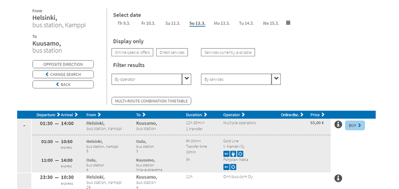 Автобусов, курсирующих из Хельсинки в Куусамо, не так много, как хотелось бы. Если точнее, то я нашла всего один прямой рейс и один вариант с пересадкой.
