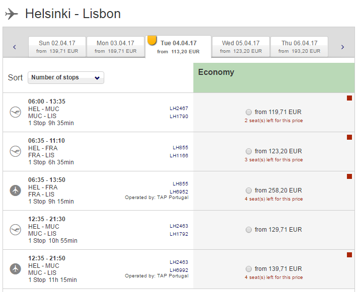 Ниже приведена информация о том, сколько часов вам потребуется, чтобы добраться от Хельсинки до Лиссабона, а также приведена примерная стоимость проезда (средняя цена билета) на том или ином виде транспорта.