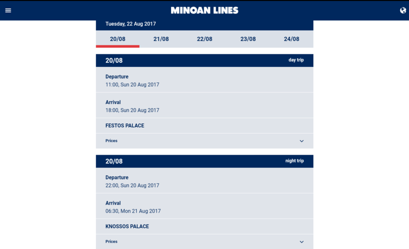 Паромы компании Minoan отправляются ежедневно в 22:00, а в 6:30 прибывают в порт Пирей. В выходные есть еще дневной рейс: