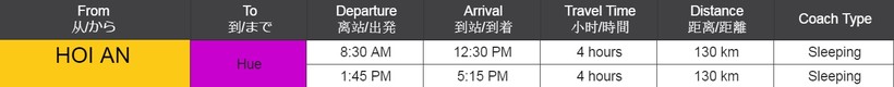 Ниже приведена информация о том, сколько часов вам потребуется, чтобы добраться от Хойана до Хюэ, а также приведена примерная стоимость проезда (средняя цена билета) на том или ином виде транспорта.