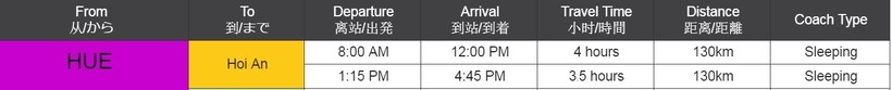 Ниже приведена информация о том, сколько часов вам потребуется, чтобы добраться от Хюэ до Хойана, а также приведена примерная стоимость проезда (средняя цена билета) на том или ином виде транспорта.