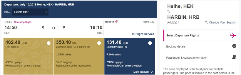 Если вы хотите сэкономить на проезде из Хэйхэ в Харбин, то вам точно не самолетами путешествовать. Перелет — удовольствие не из дешевых. :) Авиабилет на самолет от China Sourthen Airlines обойдется в 1 070 юаней (167 долларов) и более.