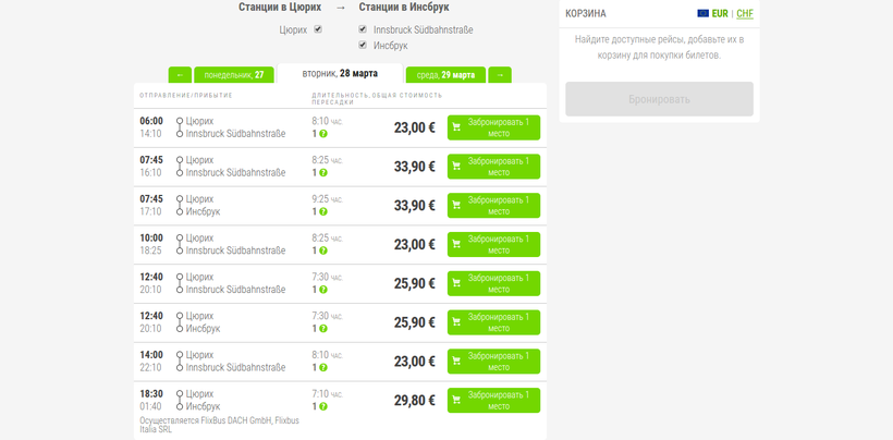 Как видно, прямых рейсов нет. Пересадка делается в Мюнхене. Отправляются же автобусы с остановки у главного железнодорожного вокзала Цюриха: На сайте FlixBus указаны две остановки, но на самом деле расположены они в одном и том же месте, это автовокзал Инсбрука, вот его месторасположение: Да, остановка также находится возле главного железнодорожного вокзала.