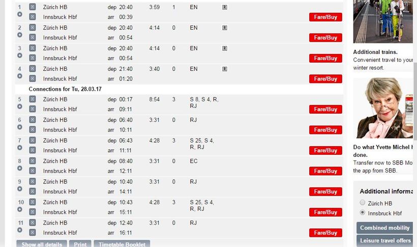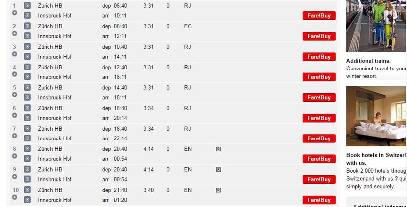 Почти все прямые поезда относятся к юрисдикции австрийских железных дорог. Поезд класса RJ это Rail Jet, вполне типичный скоростной поезд. EN расшифровывается как Euro Night, специальный ночной поезд дальнего сообщения. Оба поезда очень комфортабельны и ничем не уступают швейцарским поездам типа EC.