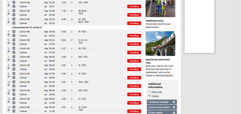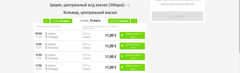 Прибывают же автобусы на остановку в Кольмаре, которая располагается у железнодорожного вокзала. На поездку потребуется около 2,5 часов, что учитывая комфортабельность автобуса совсем не будет проблемой. Учитывая расположение станций, в ряде случаев данный вариант составит отличную конкуренцию поезду, ведь он не предусматривает пересадок. Данное обстоятельство в свое время очень меня обрадовало, и я уже почти решил что поеду именно автобусом, но для очистки совести решил изучить и варианты с железной дорогой.