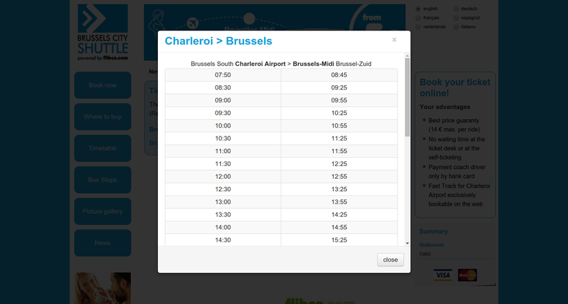 Сначала надо добраться из Шарлеруа в Брюссель. Наиболее удобно это сделать при помощи прямого автобуса-шаттла. Вот фрагмент его расписания:
