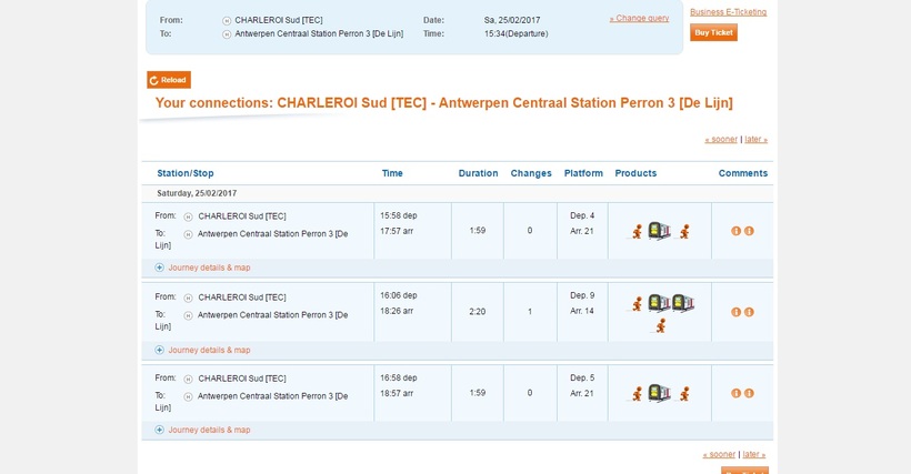Обратите внимание на то, что некоторые рейсы предусматривают пересадку. До центрального вокзала Антверпена поезд едет почти два часа.