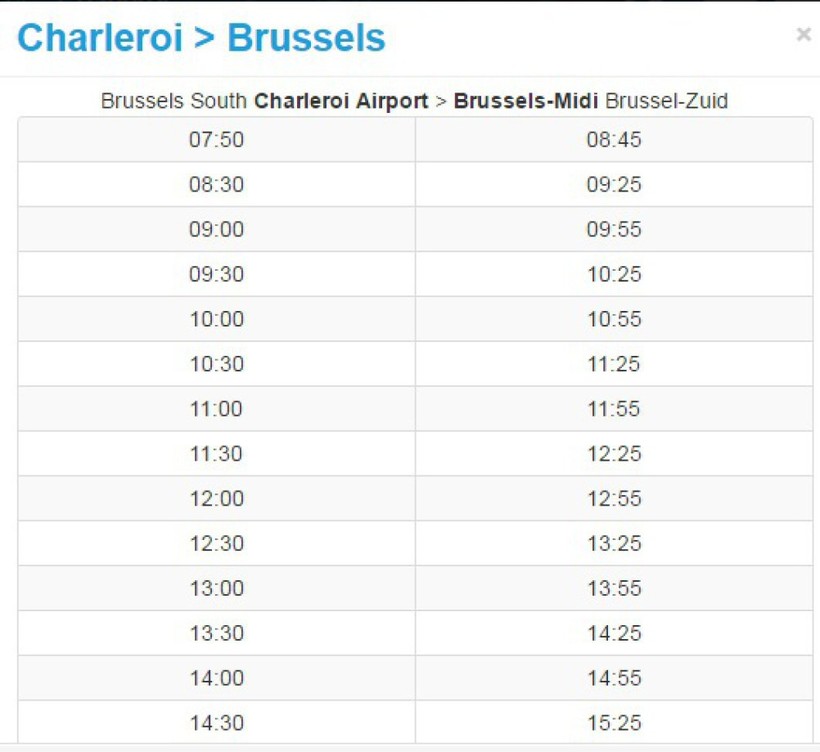 Вот тут есть вся информация о вариантах поездки из аэропорта в Шарлеруа. Как добраться из Шарлеруа в Антверпен я Вам уже рассказала. Второй вариант путешествия предусматривает пересадку в Брюсселе. Из аэропорта в Брюссель можно добраться автобусными рейсами Brussels City Shuttle. Вот фрагмент расписания рейсов.