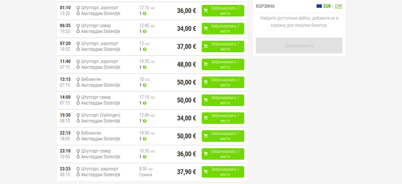 Кроме этой компании, рейсы осуществляет и еще одна, City Bus Express. Ее рейсы также отправляются от аэропорта Штутгарта и прибывают на станцию Sloterdijk. Автобус отбывает раз в сутки, в 20:40 и прибывает в 06:30. Рейсы бывают крайне редко, поэтому советую свериться с расписанием на сайте компании. Минус варианта с автобусом только в длительности поездки, она достигает в ряде случаев 19,5 часов.