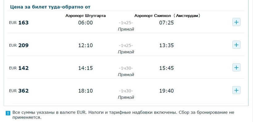 В Штутгарте имеется аэропорт, поэтому полететь на самолете будет вполне логичным вариантом. Как добраться до аэропорта можно почитать тут. Прямые рейсы по данному маршруту выполняет авиакомпания KLM. Свериться с расписанием можно на ее сайте или посмотрев для ознакомления на скриншот:
