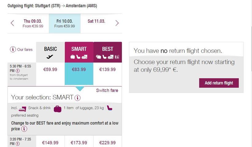 Как видно, прибывают самолеты в аэропорт Схипхол, полет займет полтора часа. Как из него попасть в Амстердам, можно почитать здесь. Авиабилеты на данное направление можно посмотреть на поисковых сайтах, подобных этому, там же и забронировать нужный вариант, ведь по данному направлению летает еще и компания German Wings, правда рейсов у нее мало, всего один: