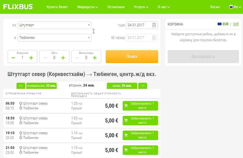 Билеты на автобус в Германии всегда стоят дешевле, чем на поезд. Переезд Штутгарт – Тюбинген на автобусе стоит от 5 евро.