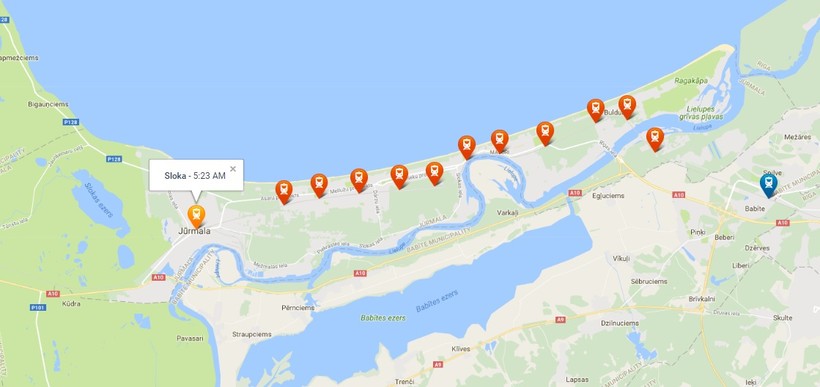 После Sloka еще идут станции Vaivari, Asari, Melluži, Pumpuri, Jaundubulti, Dubulti, Majori, Dzintari, Bulduri, Lielupe, Priedaine и все они относятся к Юрмале, на карте они обозначены оранжевыми маркерами.