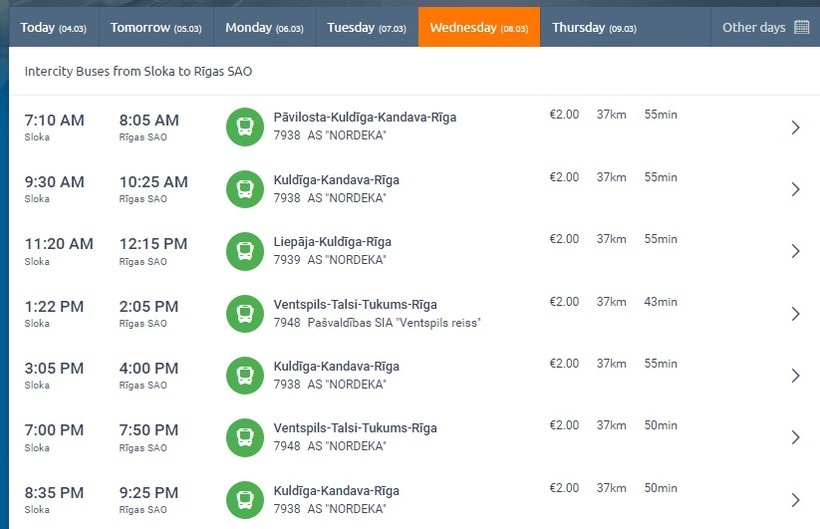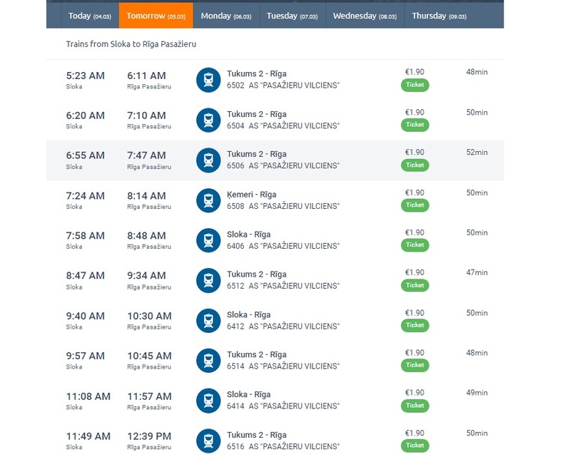 Ежедневно от станции Sloka отправляется около 25 рейсов, обратите внимание, что от станций Kūdra, Ķemeri их ходит в 2 раз меньше. Первый поезд в 5:23, а последний в 10:28.