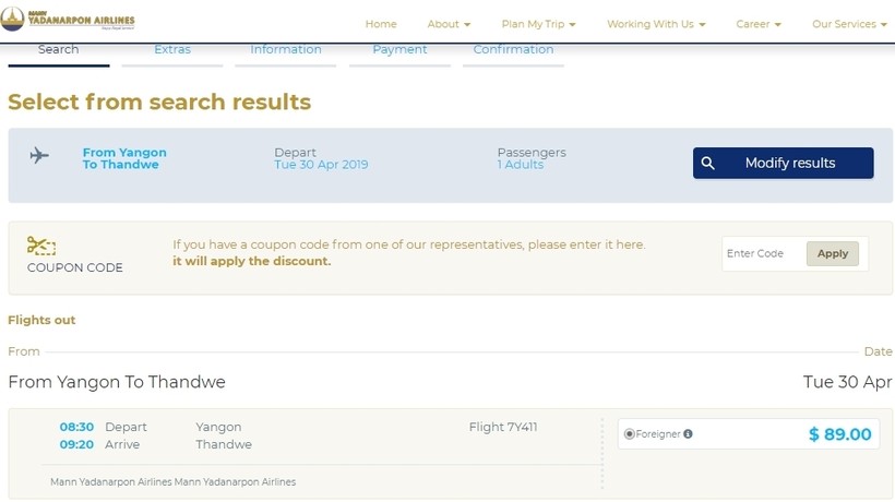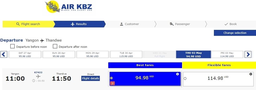Билет на самолет можно купить за 128000 кьятов (85 долларов США).