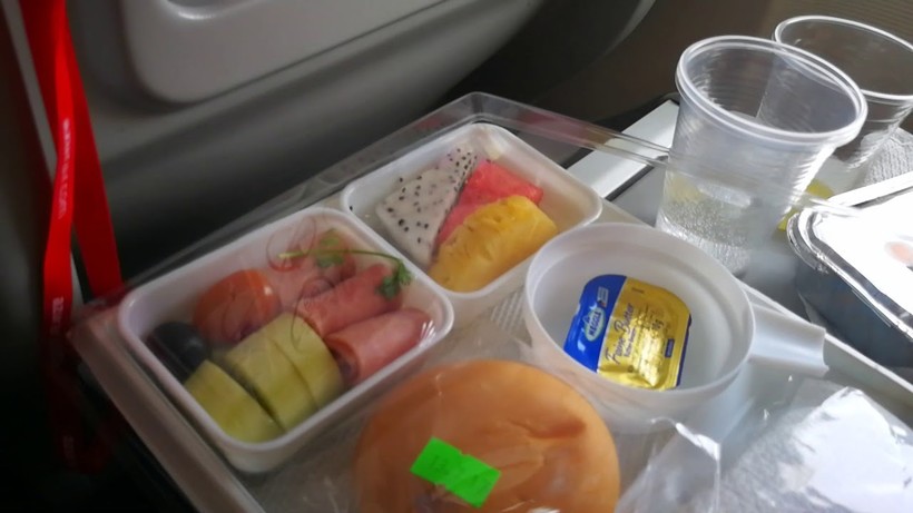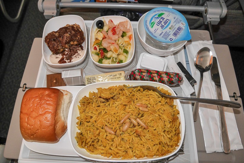 Полёт длился около 7 часов. По этой причине кормили два раза. В первый раз я заказал несколько кусочков чрезвычайно вкусного торта, булочку и какой-то даже не салат, а набор овощей и ветчины. Во второй раз поел плотнее — приобрёл себе плов и салат из фасоли.