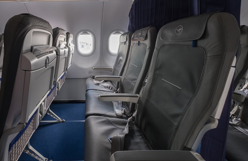 Из Франкфурта летим самолетом А-320 Neo. О его комфортности много говорят. Салон вполне обычный, а вот пространство между креслами — невероятно большое.