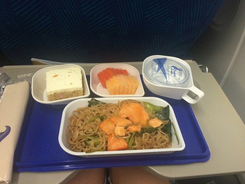 И примерно через 20 минут разносили еду. На выбор была рыба с рисом и мясо с макаронами. Также входил салат из овощей, мясная нарезка, хлеб, масло, плавленый сыр, булочка, кусочек кекса. Все было вкусно. Не понравилось, что очень долго убирали после обеда, многие пассажиры вставали и сами уносили контейнеры. Посадка прошла мягко.