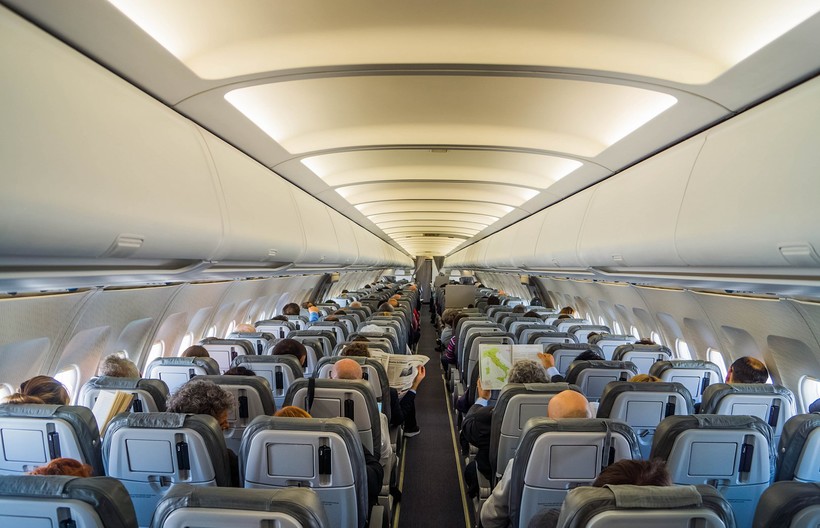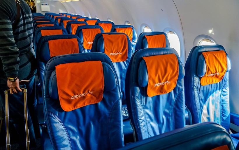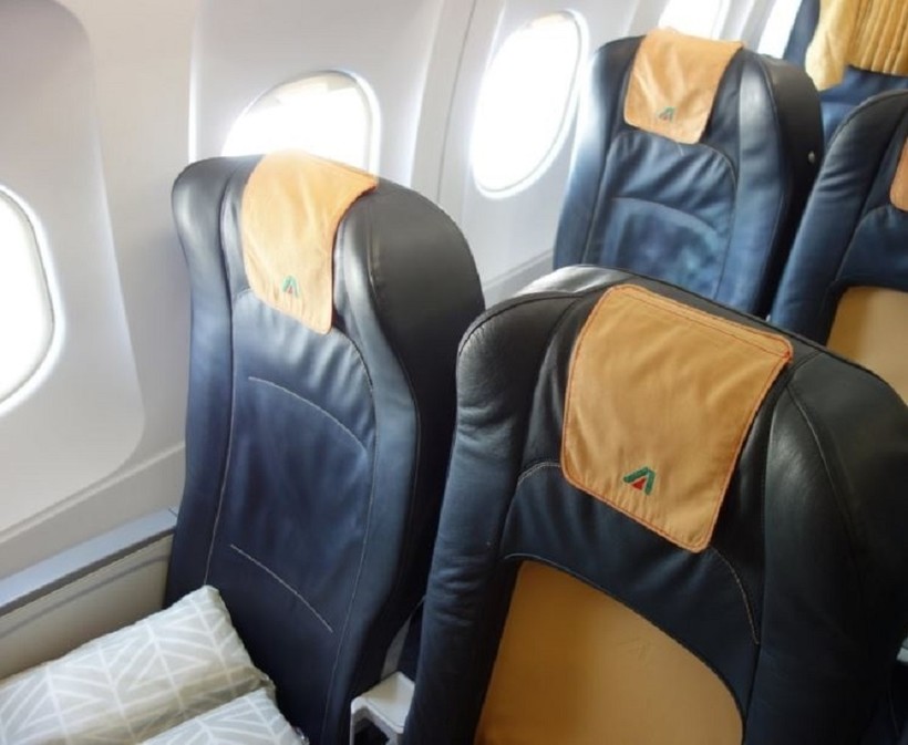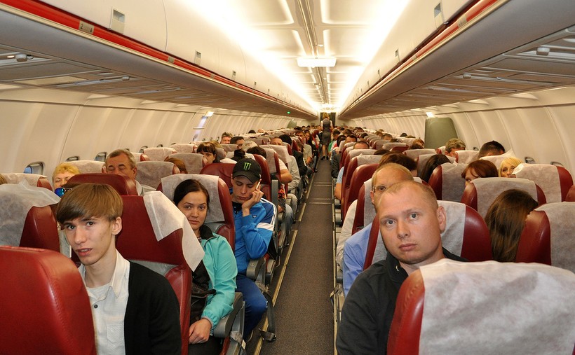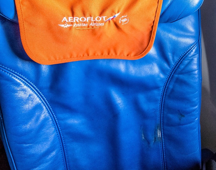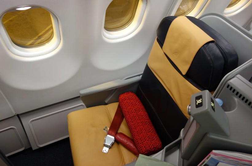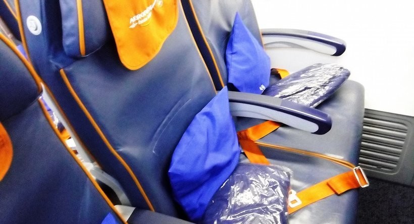 Итак, час Х настал и я поднимаюсь на борт по телетрапу. Салон эконом-класса стандартный: два ряда кожаных сидений (по 3 в каждом), изрядно продавленных, немного потертых, но опрятных, узкий проход, чистый ковер, плед и подушка для каждого пассажира. Подлокотники, подголовники и ремни в хорошем состоянии.