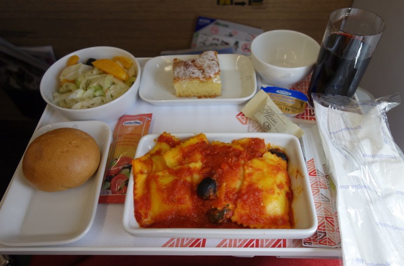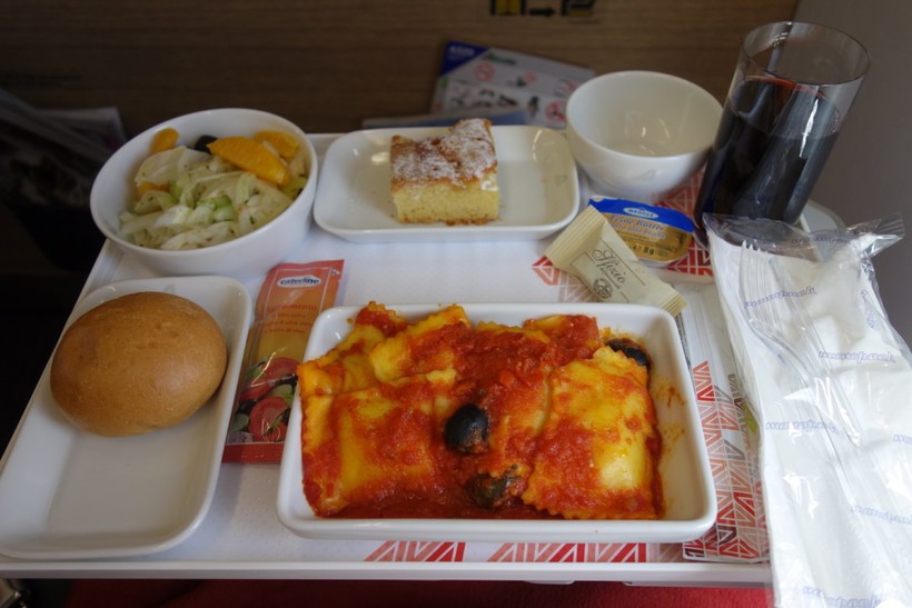На обед нам давали ели теплую лазанью, сырник и салат. Еда чем-то напоминала обеды в столовой. В общем, это не уровень мировой авиакомпании.