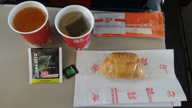Питание на борту не предусмотрено совсем. Но стало большой приятной неожиданностью, когда бортпроводники стали угощать всех пассажиров лёгким завтраком: