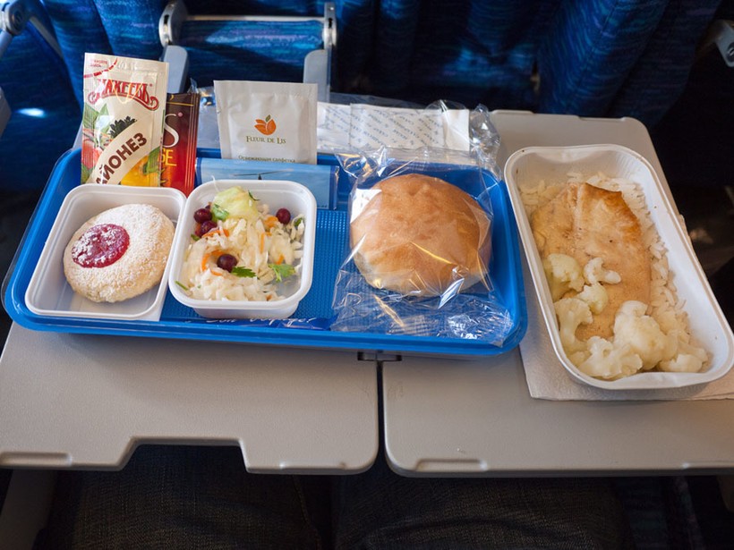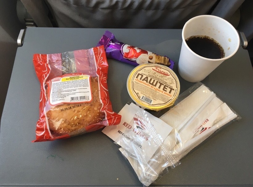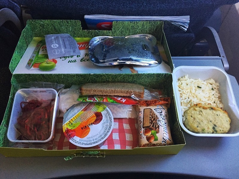 На удивление в полёте предлагали питание, хотя было оно довольно посредственным и очень скромным. Ну и на этом спасибо, многие авиакомпании сейчас совсем отказались от питания на борту. Паштет есть невозможно, когда все пассажиры открыли его, в салоне стоят ужаснейший запах, который так и не выветрился до самого конца полёта. Из напитков предлагали: чай, кофе, газированную или негазированную воду и лимонад.