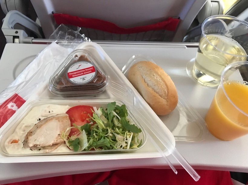 Несмотря на то, что до Вены лететь всего 2 часа 50 минут, был предложен обед. Питание мне понравилось. Хоть порция была маленькая, но всё очень свежее и вкусное: