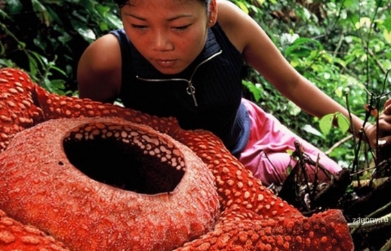 Среди цветов Индонезии можно встретить и самый крупный цветок – это раффлезия Арнольди. Только представьте, что его вес достигает семи килограмм, а в диаметре цветок может вырасти до метра. Вообще, это очень необычное растение еще и потому, что у него нет корневой системы, нет листьев и даже стебля, и это растение – паразит. Растение представляет из себя цветок с пятью толстенными листьями, запах от него очень неприятный, его еще называют «трупной лилией». Из-за запаха на него постоянно слетаются кучи мух, они его и опыляют. Когда растение цветет, то запах усиливается из-за повышения температуры самого растения примерно до 40 градусов по Цельсию. А паразитирует раффлезия Арнольди на корнях у больших деревьев, за счет которых и питается. Вот такой вот паразит-вонючка.