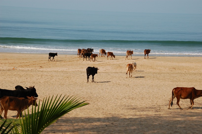 К ночи воздух не остывает, становится слегка прохладней, +26. Постепенно отмечается туристический отток, пляжи пустеют, кафе закрываются, лишь ветер разносит песок, да коровы бродят под пальмами. Это прекрасная возможность погрузиться в жизнь обычной индийской деревни. С первыми лучами солнца, 6:00, улицы медленно оживают. Весь день индусы заняты хозяйством и лишь после заката, 19:00, позволяют себе пропустить стаканчик крепкого.