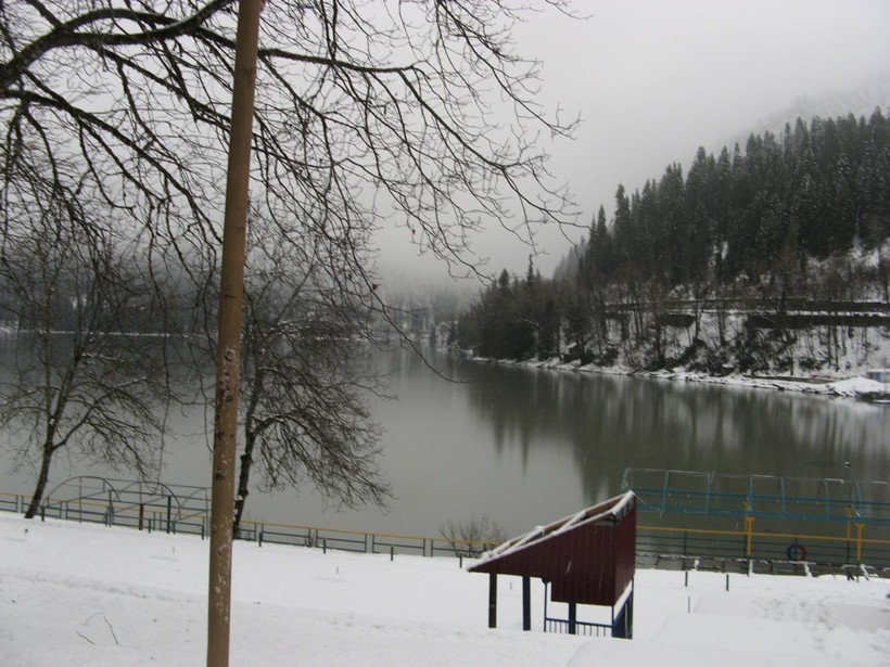 Я посещала озеро Рица летом, поэтому решила посмотреть на знакомое место ещё раз, но в другое время года. Непривычно любоваться горами, покрытыми снегом, ведь летом их покрывала густая зелёная растительность.