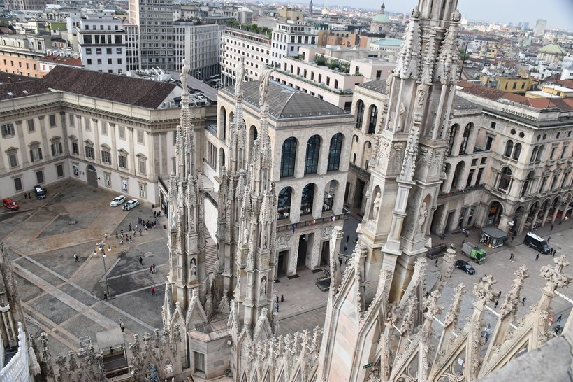 В сумерках все выглядит грандиознее. Крупный промышленный город загорался миллионом огней, местные жители спешили с работы домой, туристы продолжали бродить вокруг Дуомо, я же забралась на крышу собора. Одеться стоило теплее, вечера прохладные, не выше +8, а наверху еще и ветрено. Милан с высоты восхитителен, хотя я больше разглядывала ажурное кружево шпилей, чем городской пейзаж.