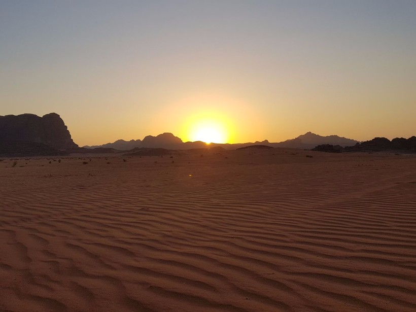 Небо сочного оттенка напоминало классическую американскую джинсу. За неделю ни облачка. Солнце встает рано, около 6:30. Закаты изумительные! Особенно в пустыне Wadi Rum, куда я ездила на экскурсию (2 дня и 1 ночь). Незабываемое мероприятие, рекомендую. С наступлением темноты, а темнеет достаточно рано, в 17:00 уже ночь, над городом будто поднимается купол планетария, усыпанный звездами.