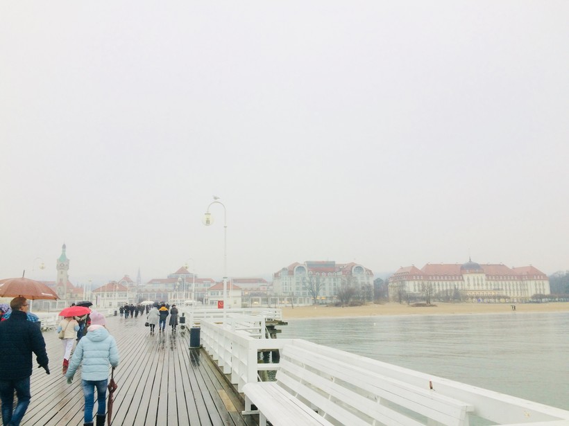 Было сыро, холодно, промозгло, +7 – максимум. Море серое, с перламутровыми всполохами, мощными волнами и ледяным дыханием, пронизывающим насквозь. Достопримечательностей в Сопоте немного, но посмотреть есть на что. Не забудьте захватить зонт. Я основательно вымокла под дождем, который вскоре трансформировался в хрупкие снежинки, тающие на лету.