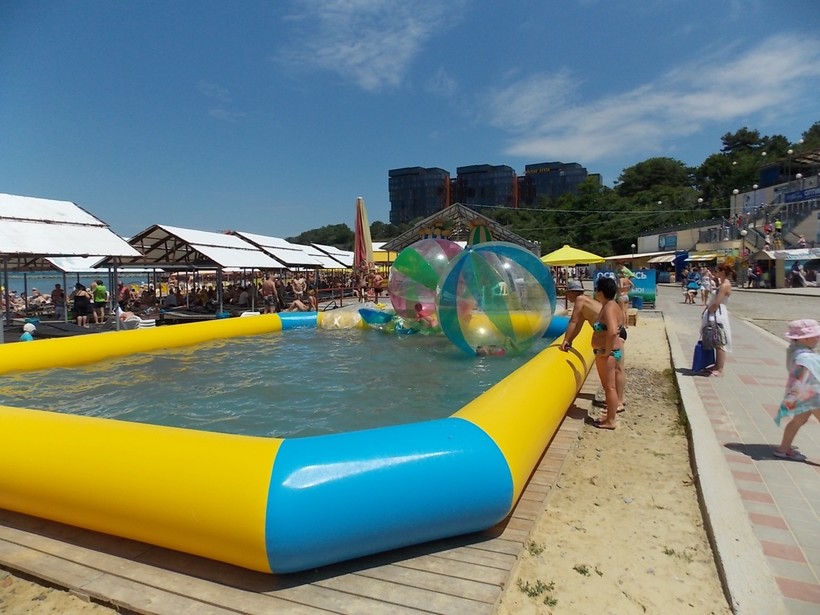 Для малышей есть немало надувных батутов, располагающихся прямо на пляже. С них очень занимательно скатываться в небольшой, но тёплый бассейн.