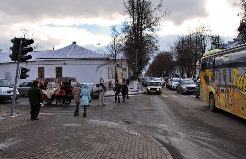 Серые тучи, лужи, пробирающий до костей ветер встретили нас в Суздале. Иногда моросил мелкий, неприятный дождик, в воздухе летали редкие снежинки, которые, опускаясь на землю, моментально таяли. Солнечные дни в эту пору выдаются редко.