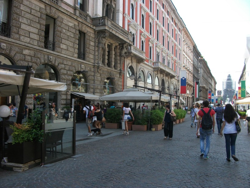 Пройдя через эту площадь, попадете на улицу Данте, она пешеходная, и славится ресторанчиками и уличными артистами - отличное место, чтобы перекусить в атмосфере чудесного Милана.
