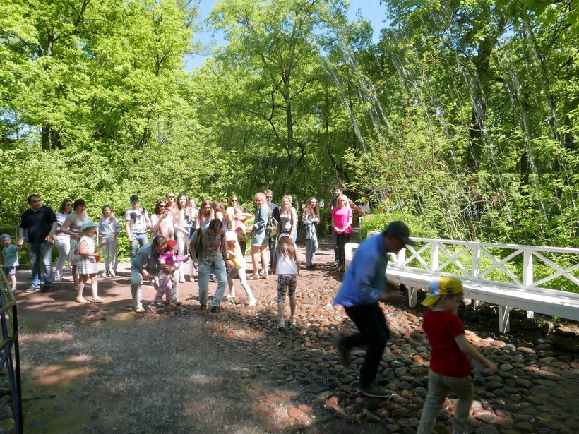 Собираясь в Петергоф, обязательно возьмите комплект сменной одежды. В парке есть фонтаны-шутихи — развлечение скорее для детей, хотя и взрослые порой не прочь повеселиться. Хотите, открою тайну? Запускаются шутихи не самопроизвольно. В ближайших кустах сидит специальный дядечка, который запускает водяные струи нажатием на педальку.
