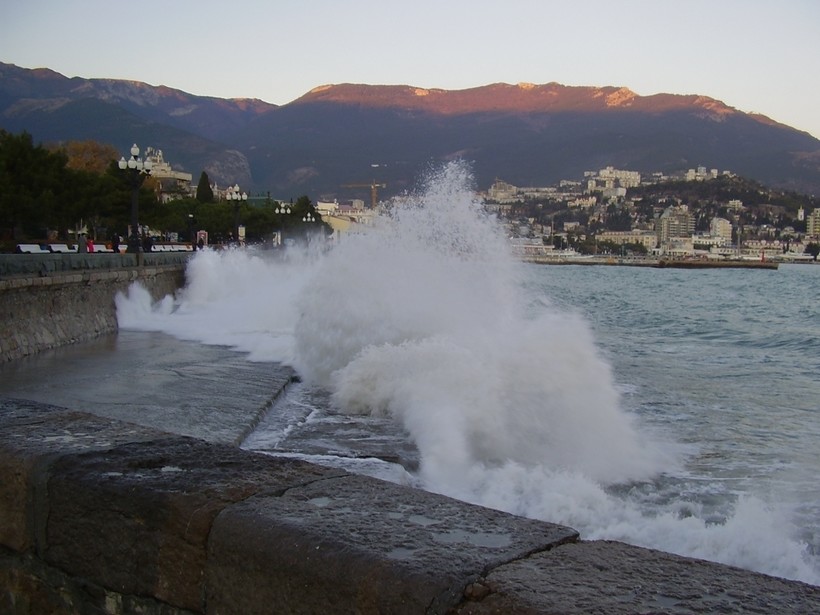 Погода приятно поражала мягкостью, градусник показывал +10 градусов, но ласково пригревало солнце, а горы надежно защищали от пронизывающих сквозняков. По улице я ходила в легкой ветровке. Людей мало, вокруг тепло, красиво, уютно. Правда, один день в Ялте дул довольно сильный бриз и вызвал невероятные морские волны, но не ощущался такой сковывающий тело холод, как в западной части.