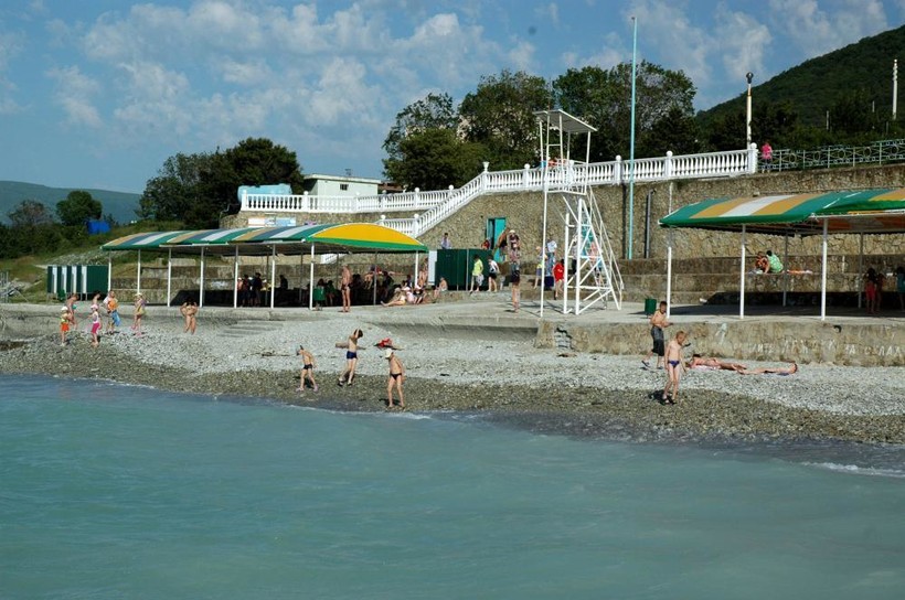 Место довольно узкое, покрытое хорошей крупной галькой. Немногочисленные оставшиеся отдыхающие пользуются особым вниманием сотрудников тамошней инфраструктуры — скидки на инвентарь, дисконт в общепите — в порядке вещей. Продолжают работать прогулочные катера и морские аттракционы.