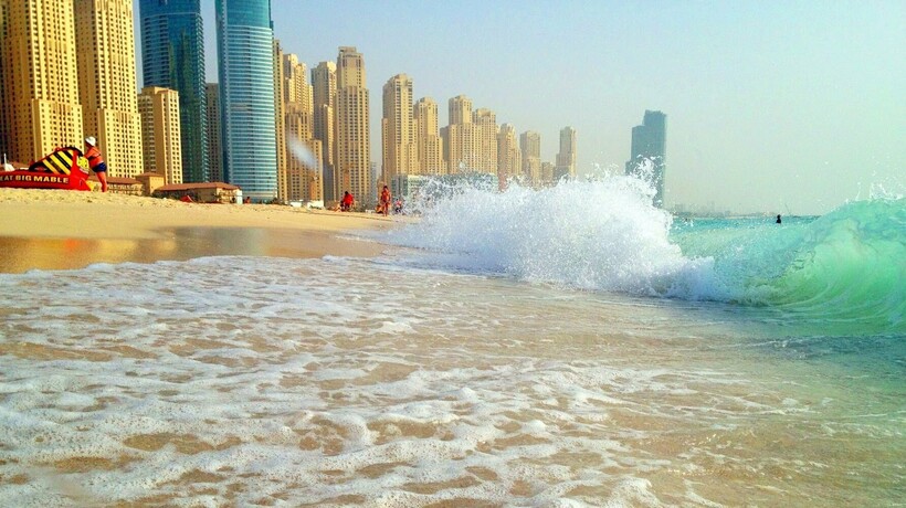 Пляжи в ОАЭ песчаные, вход в воду пологий. Пляжи Персидского залива самые популярные, с безопасными волнами, к ним относятся пляжи 6 эмиратов. Эмират Фуджейра окружен Оманским заливом, в котором часто бывают высокие и сильные волны.