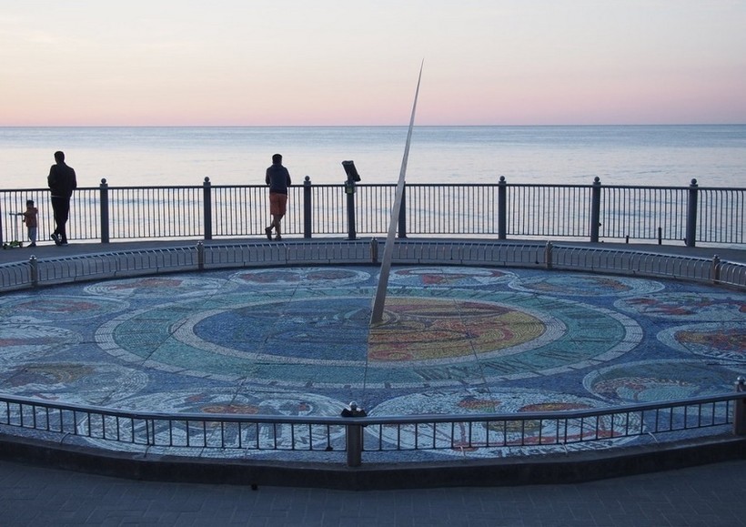 Древний примитивный хронометр одинаково красив как в дневных бликах июльского солнца, так и вечером.